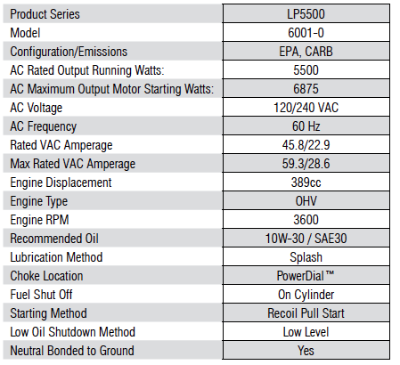 The LP 5500 is the smart choice for portable home emergency backup power, utilizing the benefits of propane to provide enough power to cover essential circuits in your home. |